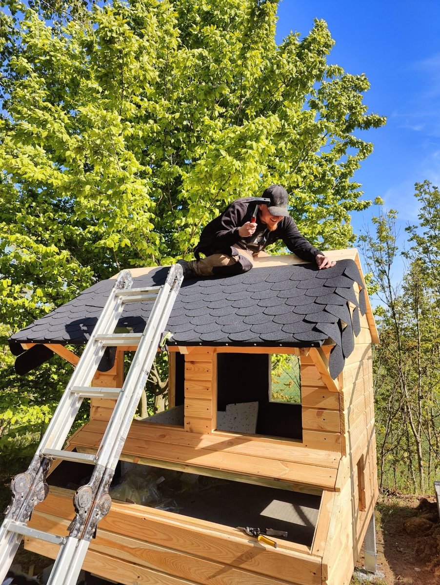 Prace na dachu kurnika - obijanie dachu gontem bitumicznym.