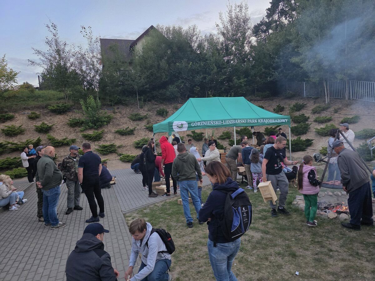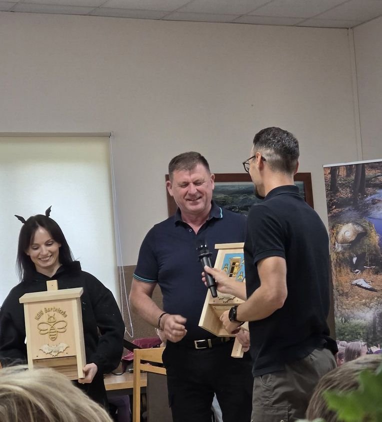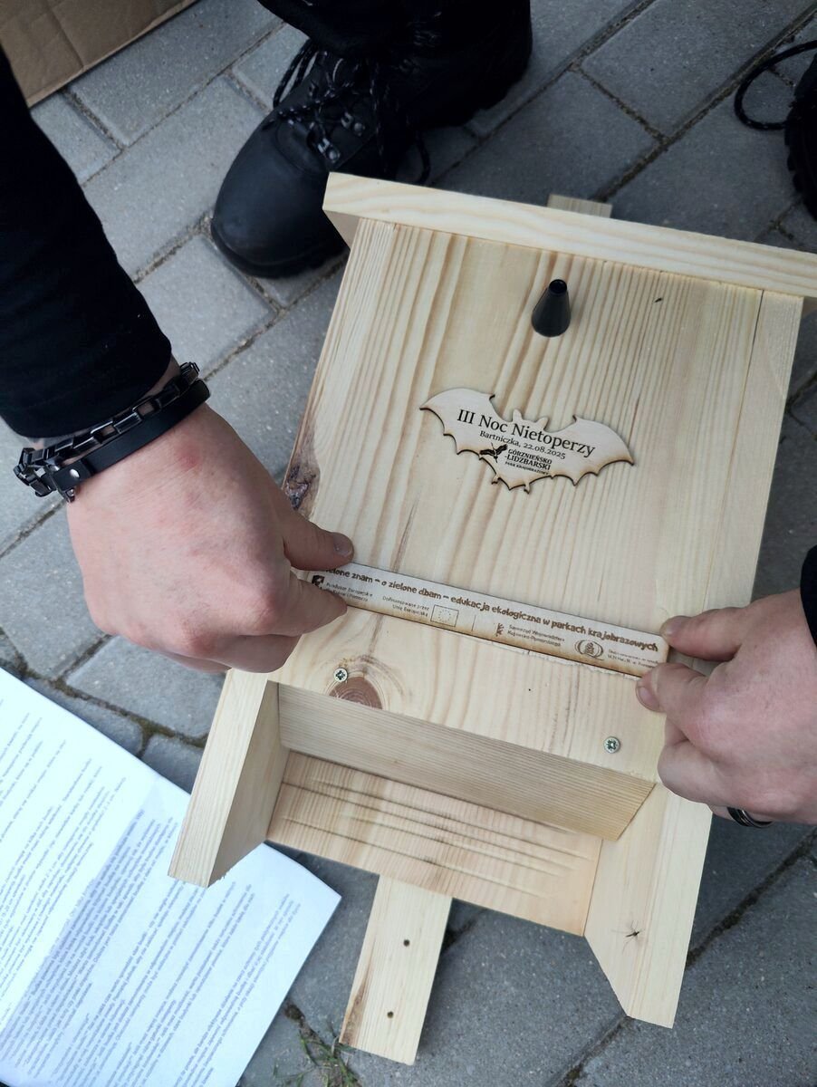 Po prezentacji, ciasteczkach, pytaniach i zdziwieniach zabraliśmy się za majsterkowanie (to, co lubimy!). Każda rodzina dostała do skręcenia budkę dla nietoperzy – wraz z instrukcją i narzędziami. Przy pracach konstrukcyjnych wspierało nas nadal KGW, dokarmiając orzeźwiającą lemoniadą i innymi dobrociami. Budki wyszły piękne – drewniane, ze specjalną pamiątkową plakietką. Było nas naprawdę dużo, więc zbudowaliśmy wspólnie małe nietoperzowe osiedle. Rządowe programy budowy mieszkań mogłyby się od nas uczyć.