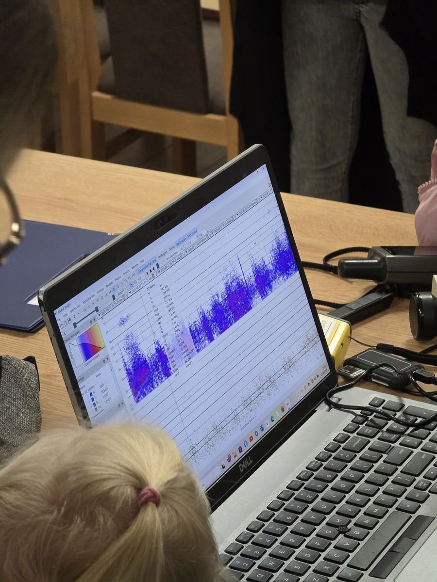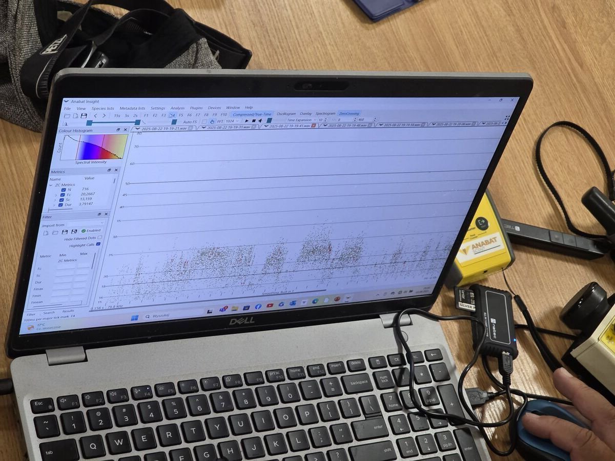 Po zapadnięciu zmroku, regularnie nakłuwani przez komary, ale głodni dalszych wrażeń, poszliśmy na nasłuchy detektorowe. W zamontowaną siatkę chiropterologiczną tym razem niestety nie udało się złapać żadnego nietoperza, ale za to mogliśmy je nagrać i rozpoznać gatunki. Posłuchanie tego, czego nie da się usłyszeć bez specjalistycznego sprzętu, było wyjątkową atrakcją. W programie Anabat Insight można było zobaczyć, jak wyglądają nietoperzowe komunikaty na wykresach, odczytać moment, w którym prawdopodobnie zdobycz została schwytana, i posłuchać ich po odpowiednim obniżeniu do naszych, słyszalnych częstotliwości.